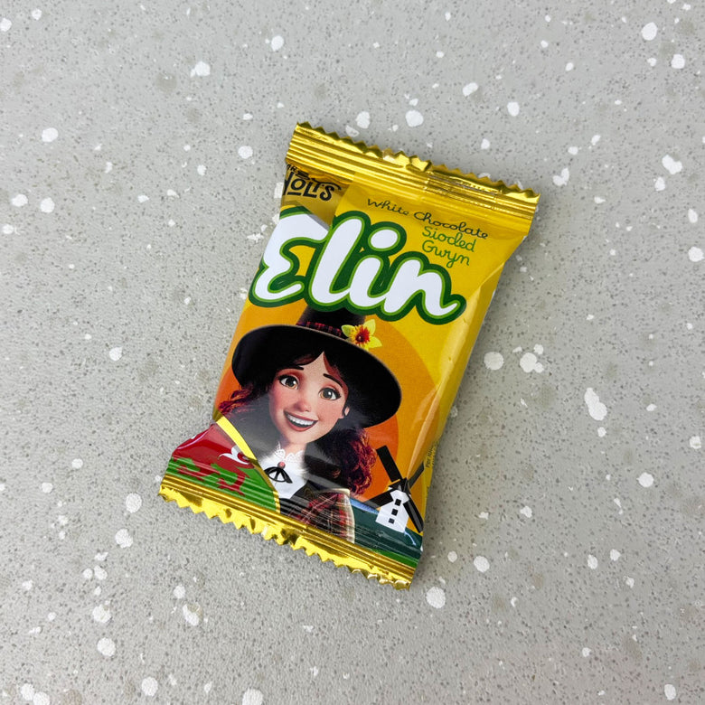 A mini bar of qualitywhite chocolate handmade by Wales' own Willy Wonka, Mr Holt, featuring Elino'r felin.